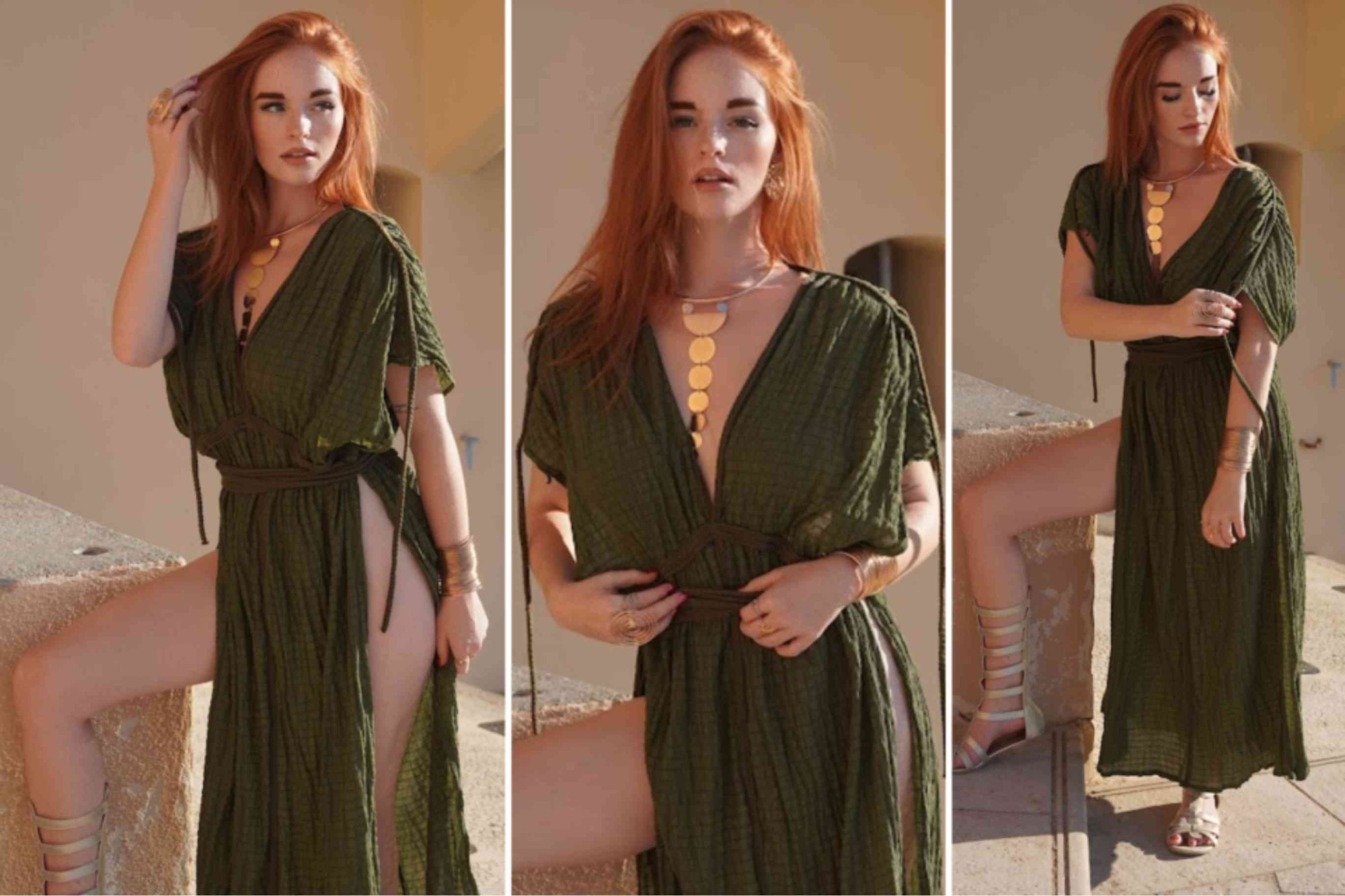 Combining comfort and chic, this look from the Aurales Bohemian Collection is for those who enjoy lounging by the sea with a touch of bohemian elegance. The soft sage-green hooded dress drapes gently, offering both style and ease, while the playful gladiator-style sandals add a rustic, free-spirited vibe. This outfit captures the essence of a laid-back day at the beach with a focus on natural beauty and relaxed sophistication.