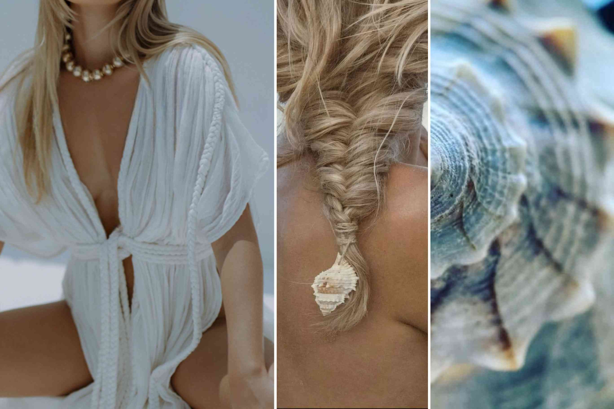 Tied by nature, touched by the sea. A flowing white dress, gathered with soft natural cords, adorned with pearl accents. Pearls that shimmer gently, a braid crowned with a single shell — simple, radiant, timeless. It’s in these quiet details that true elegance lives. โจLet your bridal style whisper of the sea and let the details tell your love story. Where would you dream of wearing this look? #SaltAndSandsWeddings #CoastalElegance #PureCharm #BohoBride #cotedazur #TimelessDetails