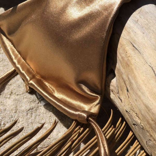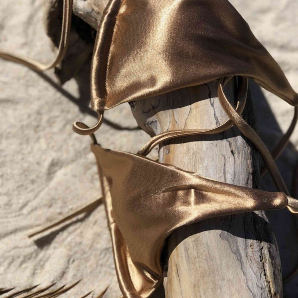 The gold top has a versatile style with both a triangle shape and a soft bra style, making it suitable for different body types and offering comfort. The neckline can be worn as a halterneck or a seductive V-neck, allowing you to vary your look. The lightweight stretch fabric provides a comfortable fit and freedom of movement. Removable padding lets you adjust the desired level of support and shaping.