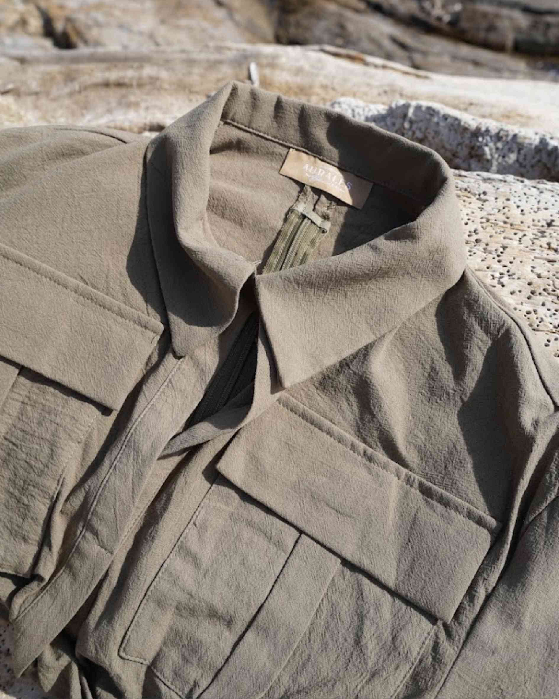 Designed with a structured yet relaxed fit, this blouse features oversized pockets and a subtle texture that adds depth and interest. Perfect for layering or wearing on its own, it’s an essential piece for a laid-back yet polished wardrobe.