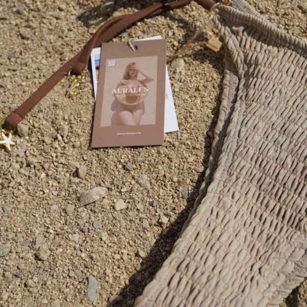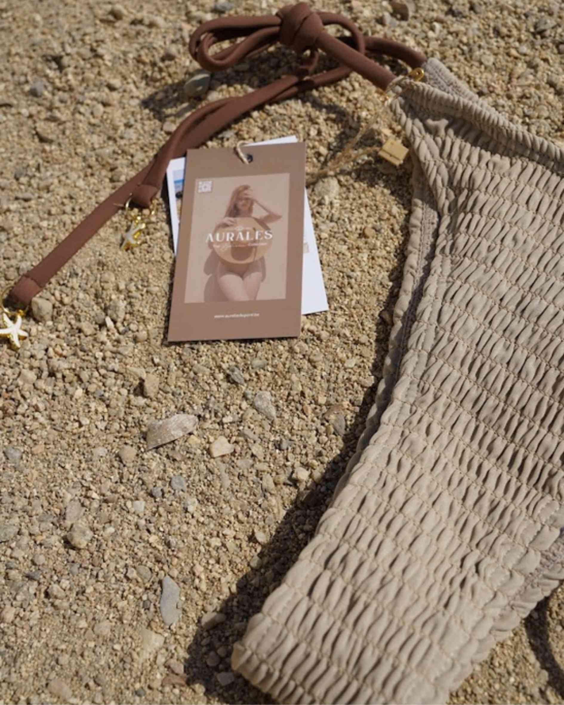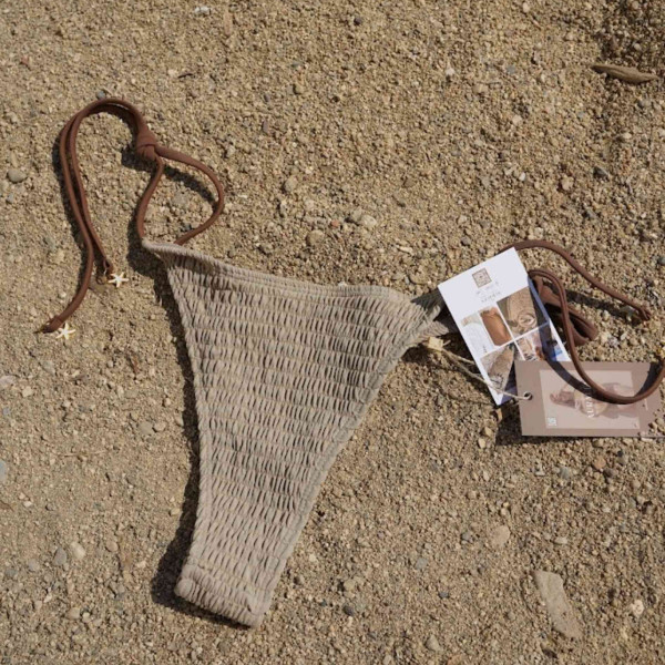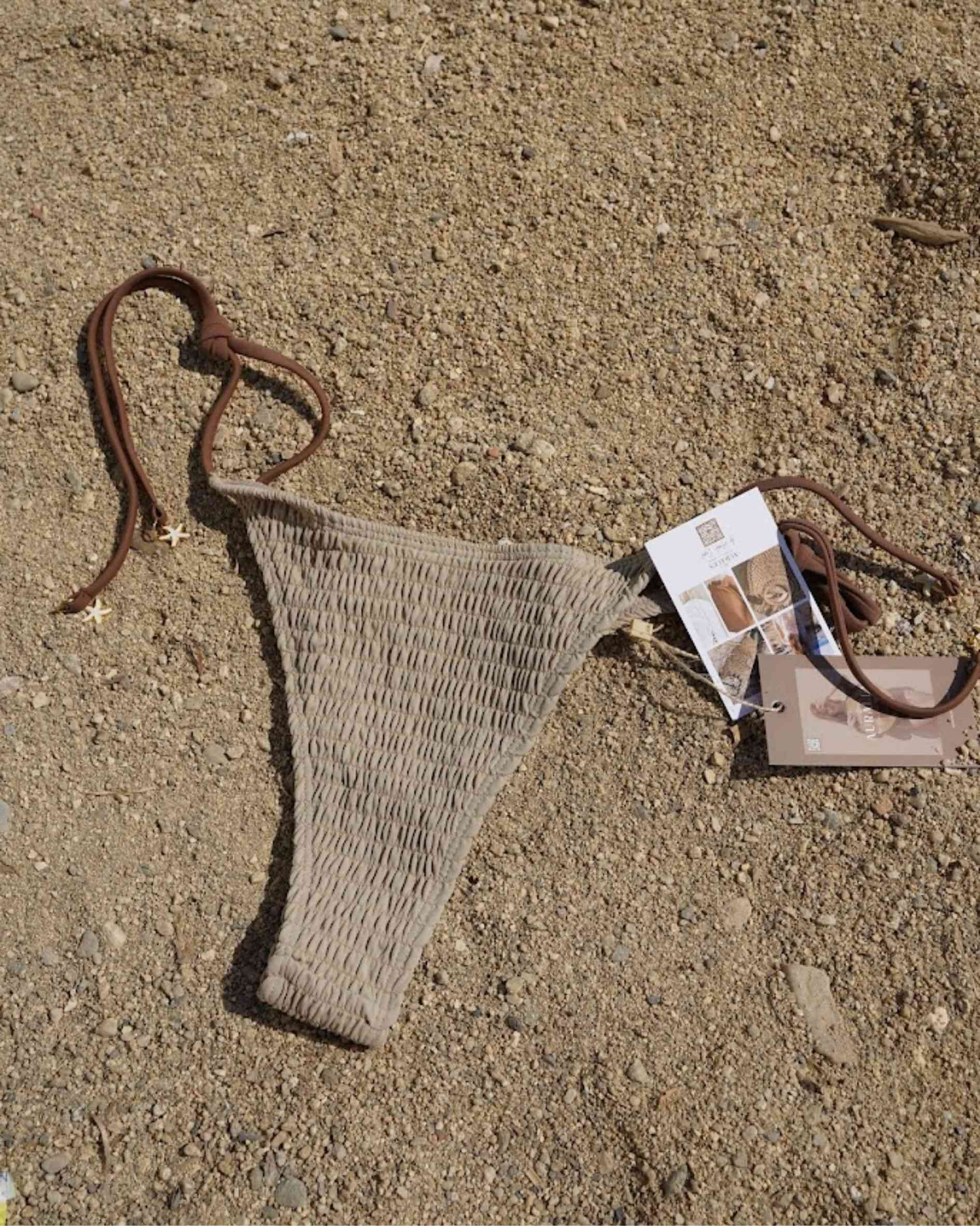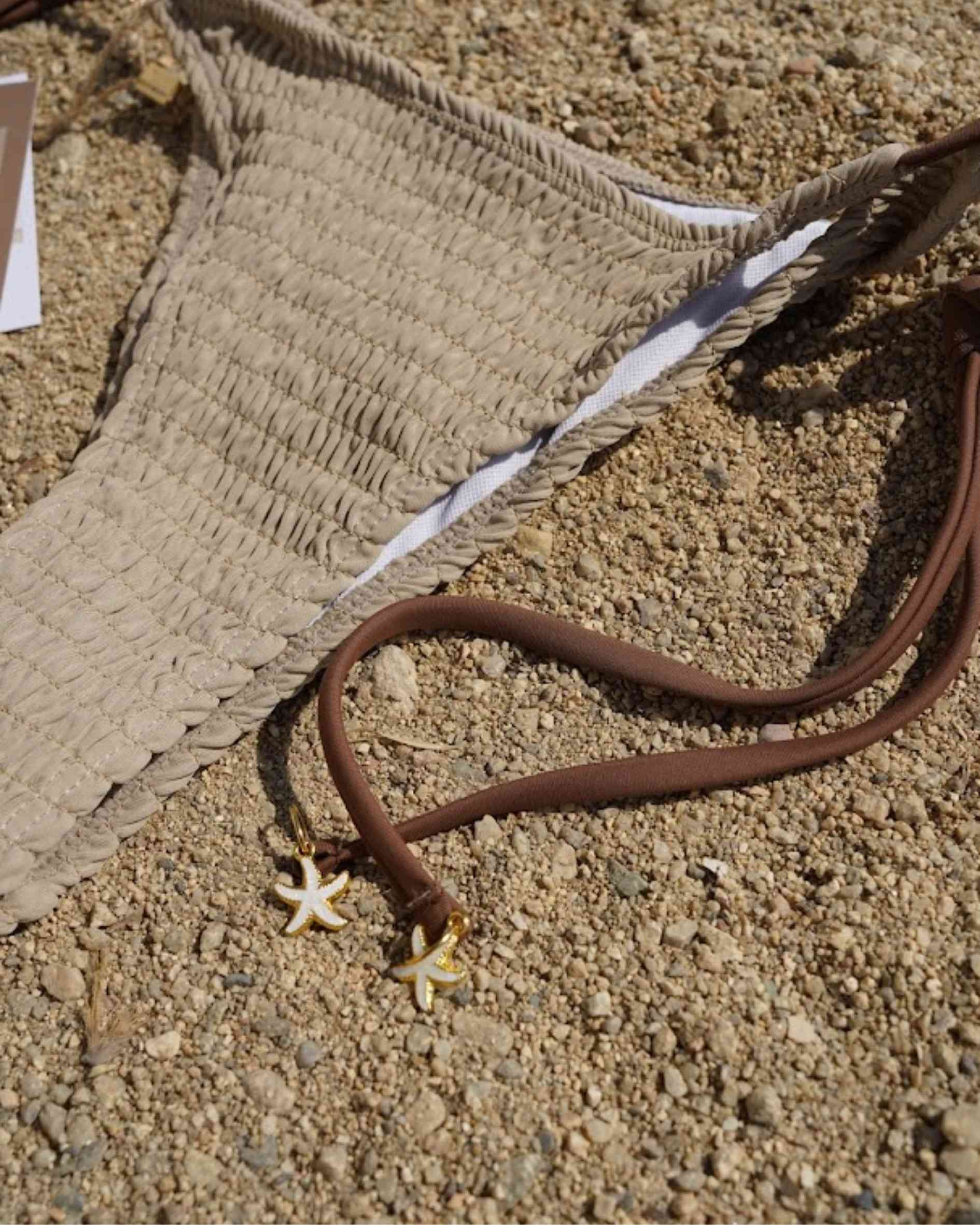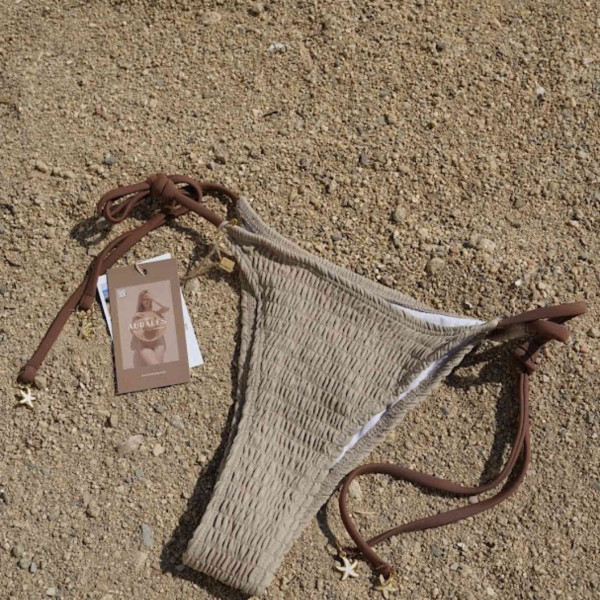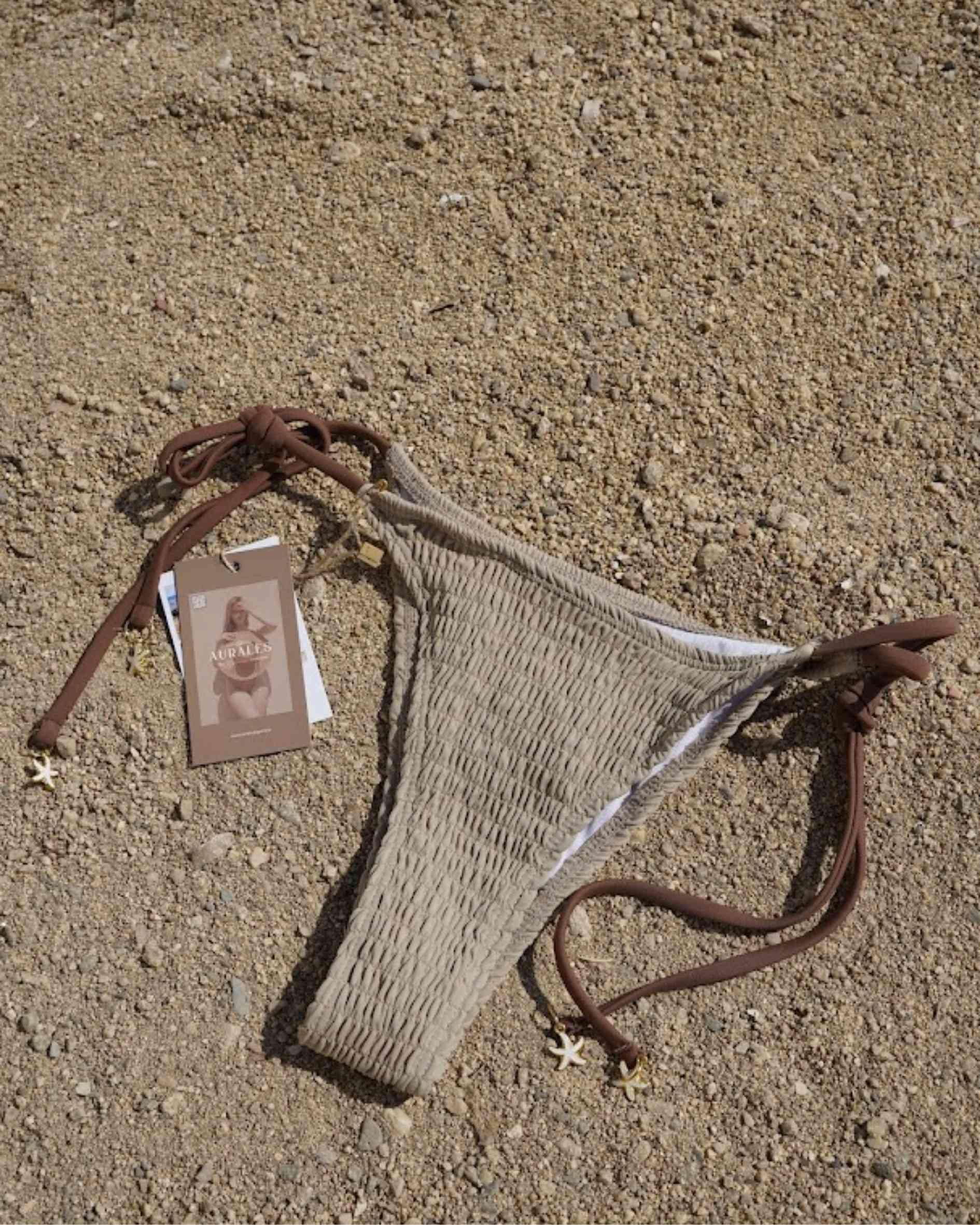 Designed for the beach lover, this boho textured bikini bottom crafted from soft, smocked fabric in a warm sand tone, it offers a flattering fit that hugs your curves while ensuring comfort. The adjustable brown tie straps allow for a personalized fit, while delicate gold starfish charms add a touch of seaside luxury. Paired with the matching bikini top or styled with a breezy cover-up, this piece embodies the essence of bohemian beach life.