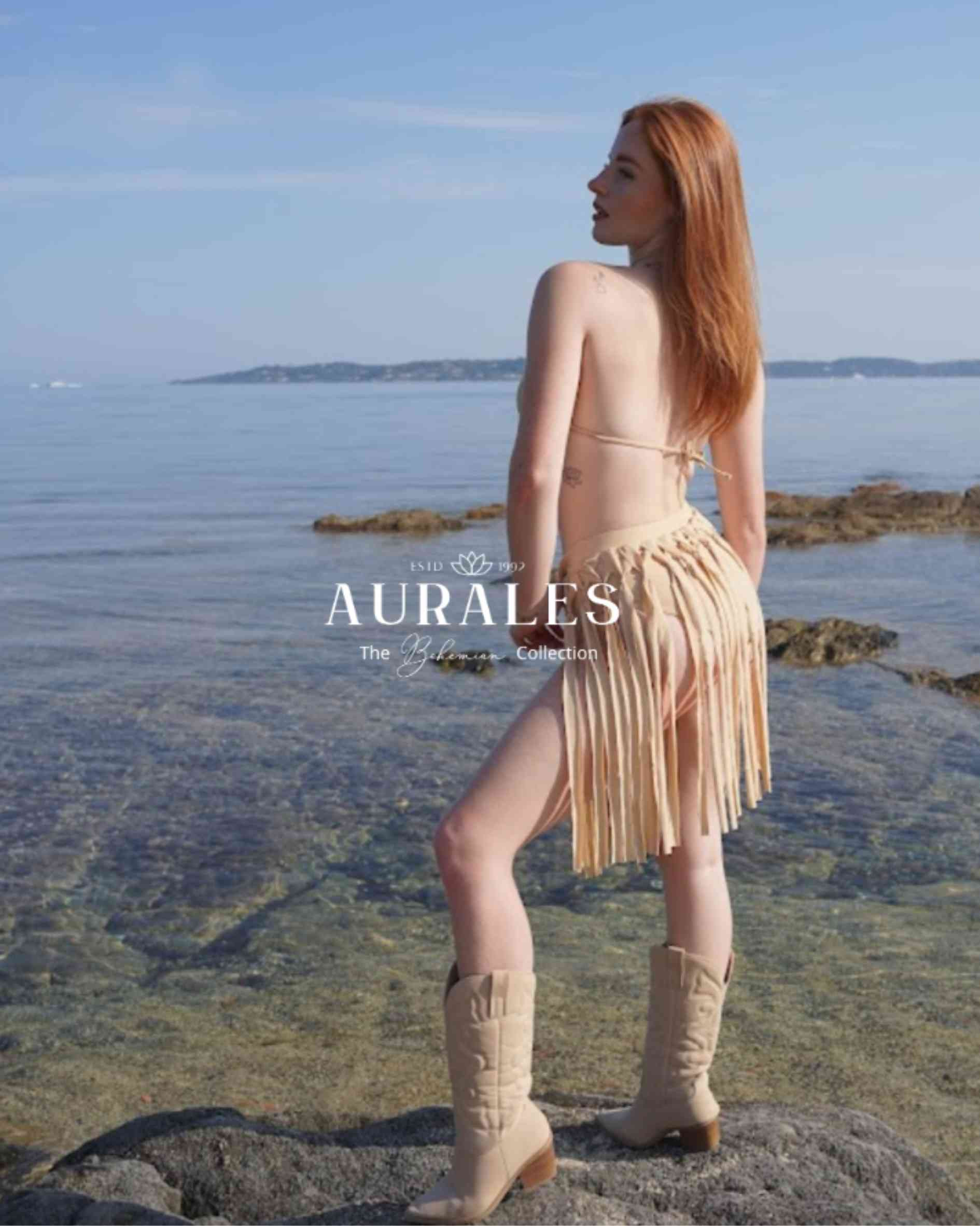 This Bohemian Tan bikini set with skirt is not only perfect for days at the beach or pool, but can also be worn at festivals! The bohemian style, playful skirt and fashionable details like the halter neck and tie back closure make this outfit a standout choice for festival goers. The stretch fabric and removable padding ensure a perfect fit and support, while the skirt adds a playful flair to your festival outfit. Pair the bikini set with a pair of boho sandals, sunglasses and a floral wreath in your hair and you're ready to shin.