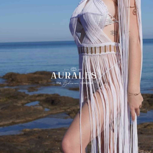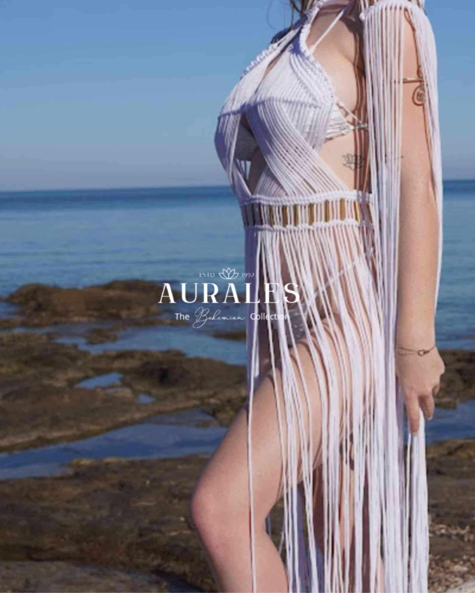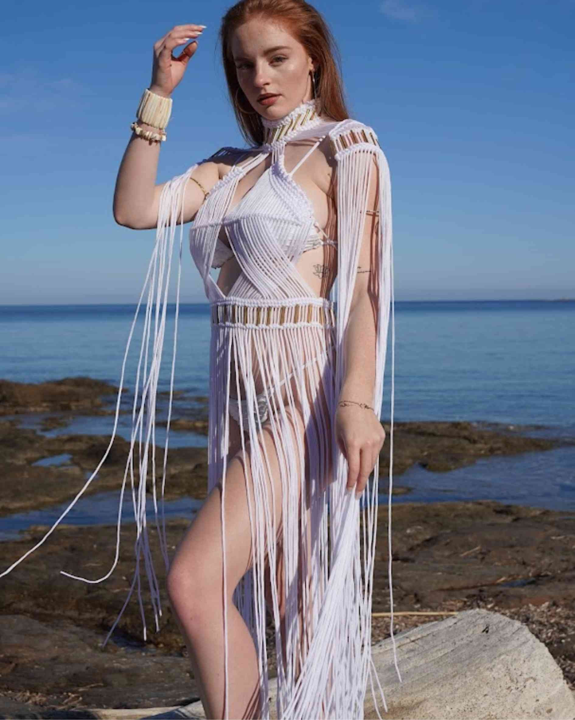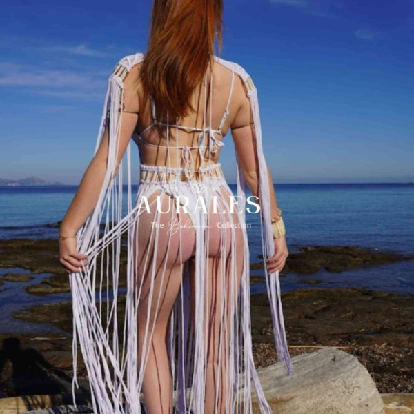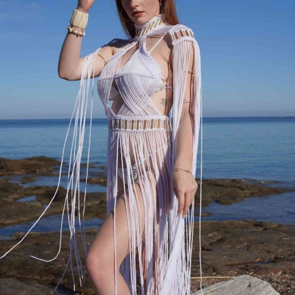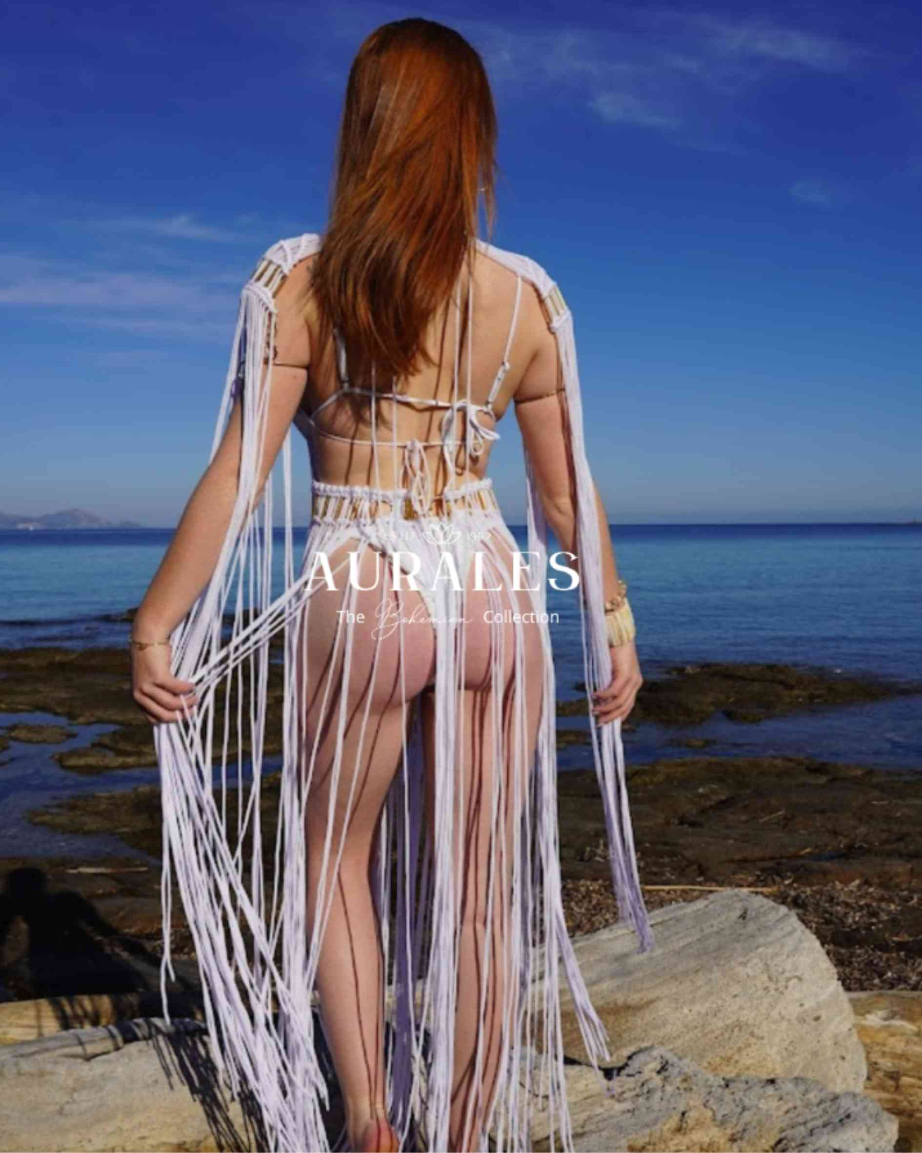 The Temptation Calm Cape Dress, coastal tranquility. Designed with a sculpting halter neckline and a dramatic cascade of soft, flowing fringe, this dress captures movement, light and the calm power of presence. The cape-like silhouette creates a sense of freedom — ideal for sun-drenched escapes, barefoot walks or golden-hour styling. Wear it over a bikini or as a daring statement on its own.