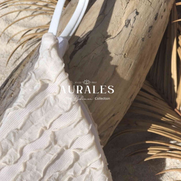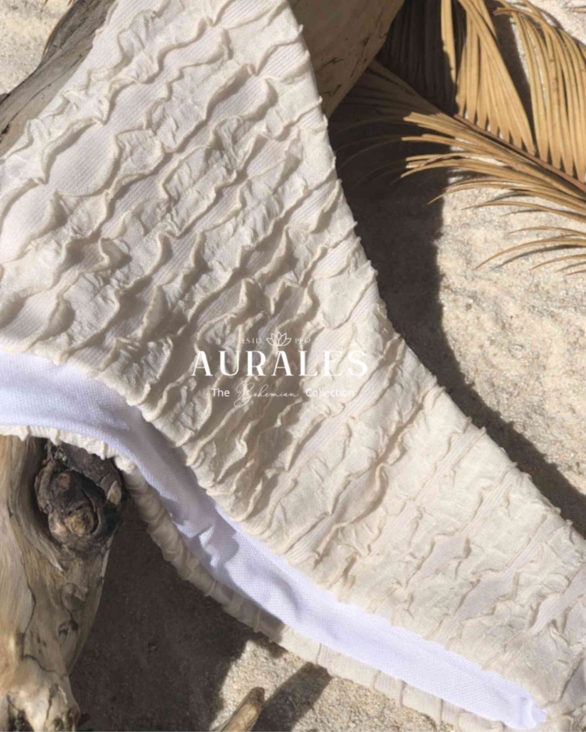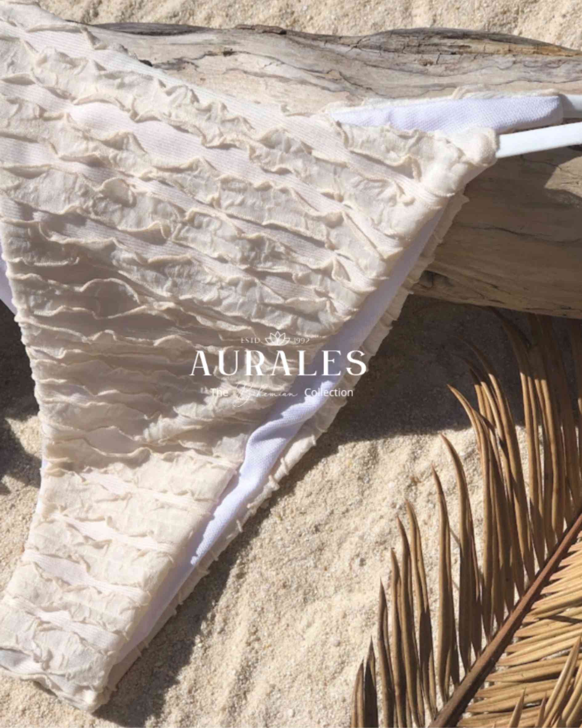 The Mermaid Sands Under is a soft whisper of shoreline elegance — minimal in shape, rich in texture. Crafted in a delicate sand tone with subtle ruffled layering. The double strap sides offer a modern cut with a barely-there feel, making it your go-to piece for sun-drenched escapes and poolside lounging. Light, textured and endlessly wearable — it’s the boho mermaid’s essential.