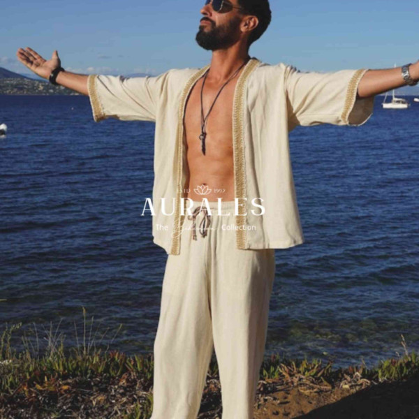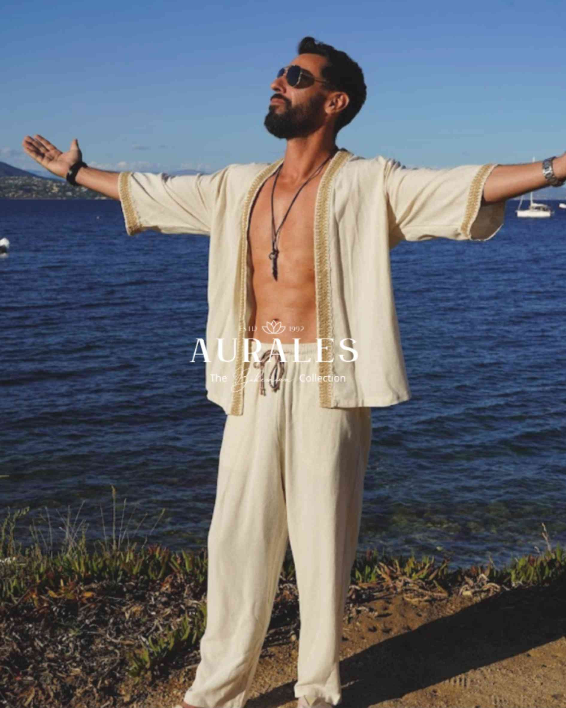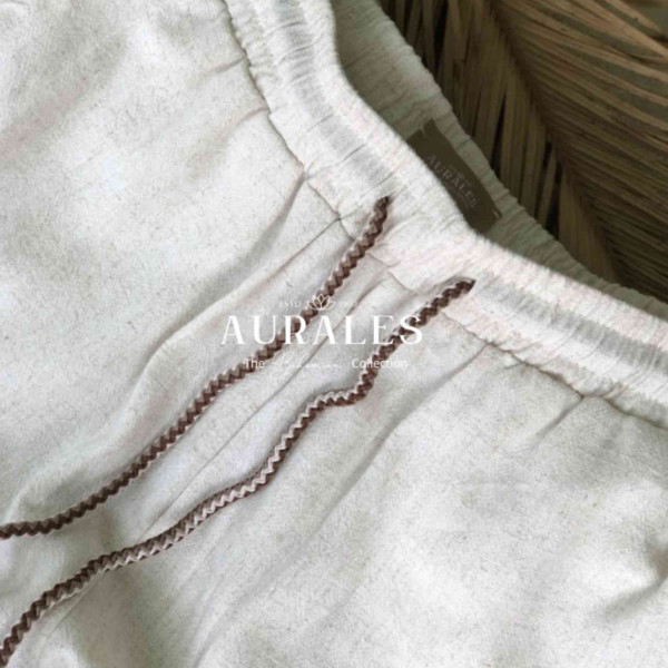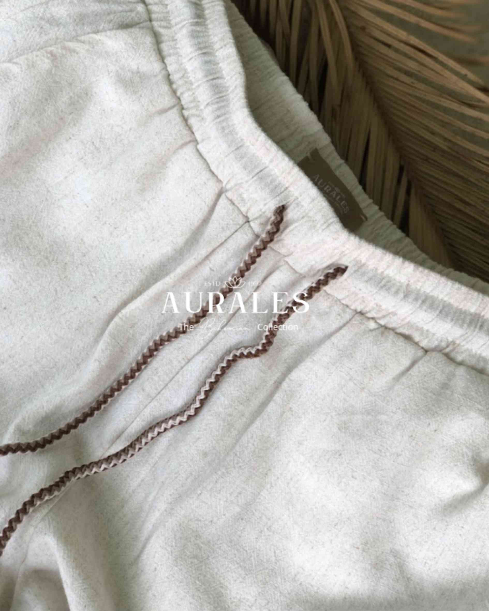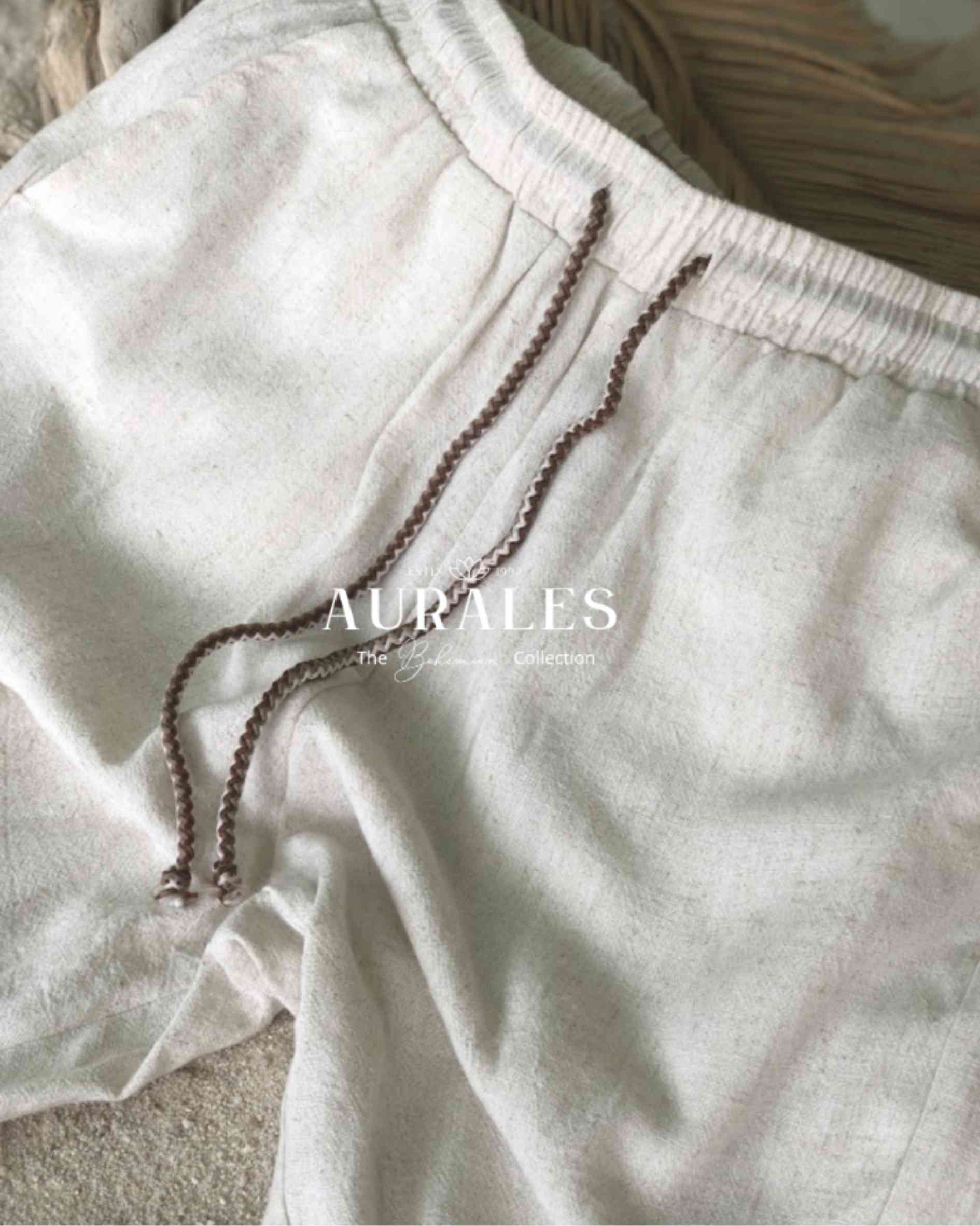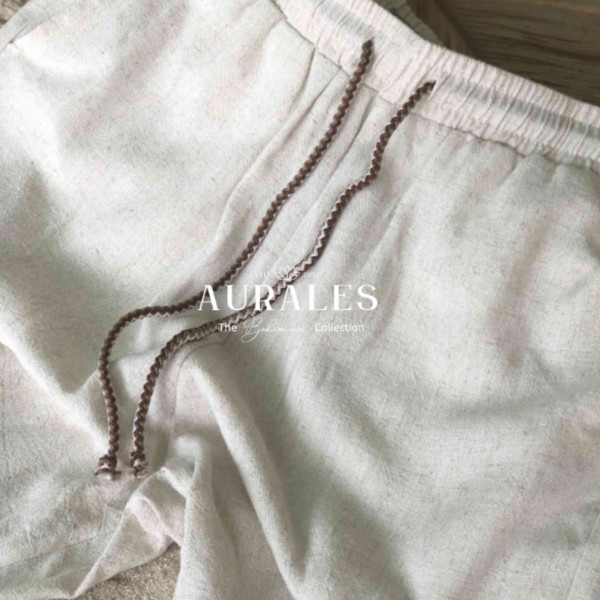 The Medina Dreams Trousers with a soft beige hue and silhouette, these trousers blend relaxed structure with subtle detail. Featuring a comfortable drawstring waist, practical pockets and a flowing woven fabric. This piece invites you to move freely, dream deeply and carry the spirit of bohemia wherever you go.