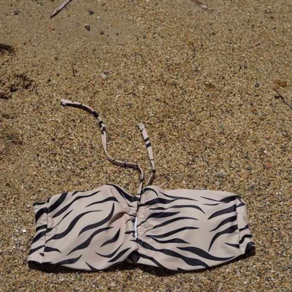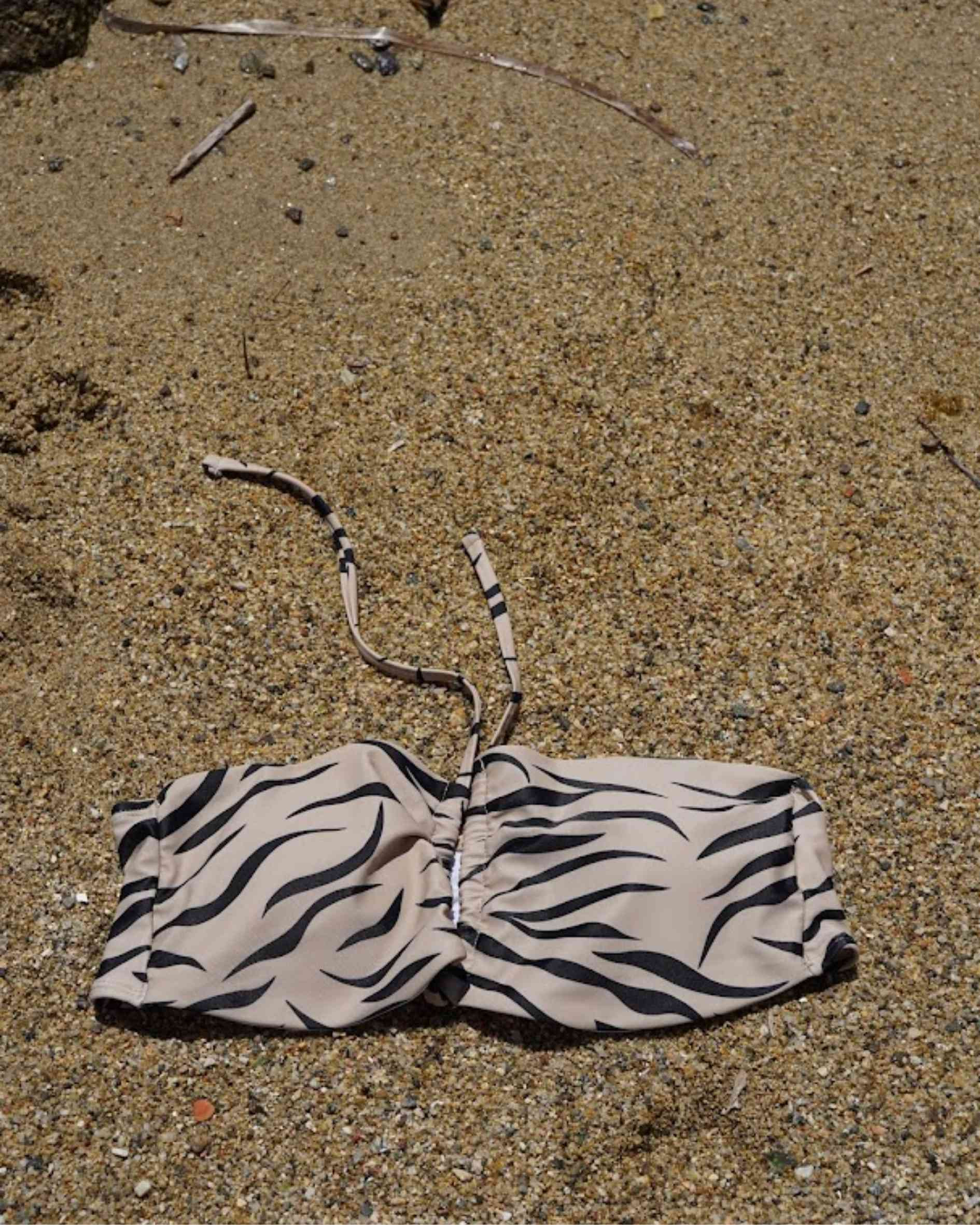 This bandeau bikini top features a ruched drawstring detail for a customizable fit and removable padding for optional shape. Crafted in high-stretch fabric with a khaki and black zebra stripe print, it offers comfort and a statement-making style. The design enhances natural curves while remaining chic.