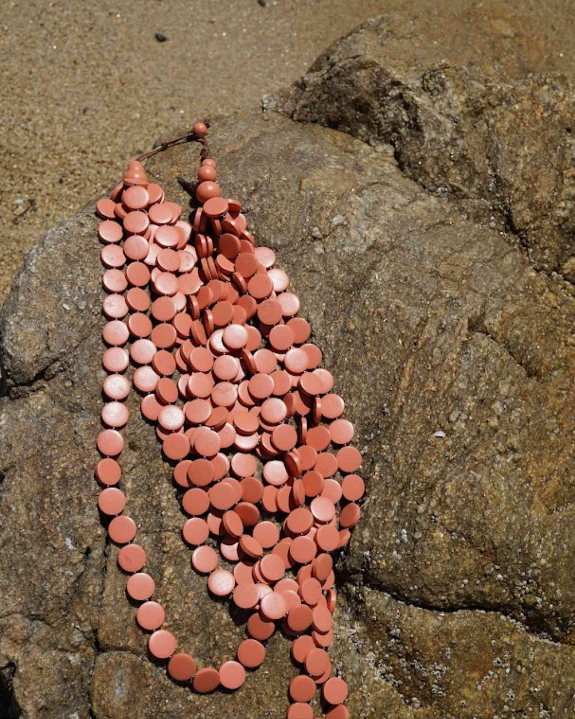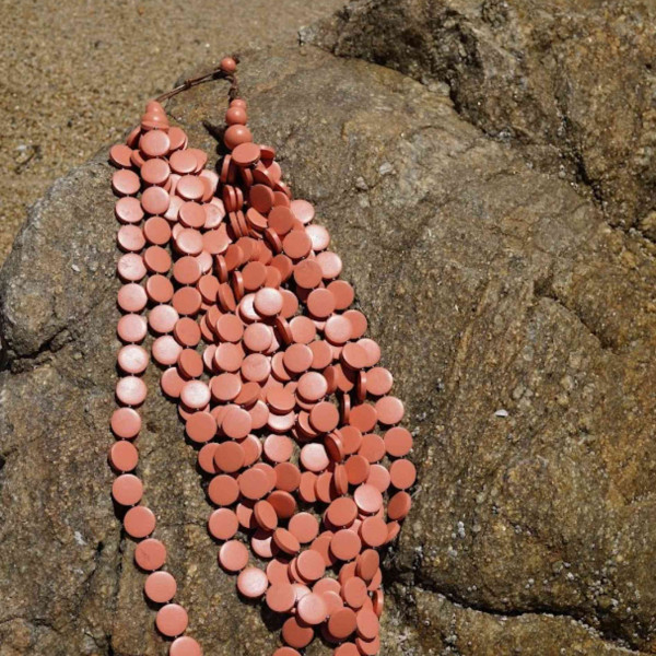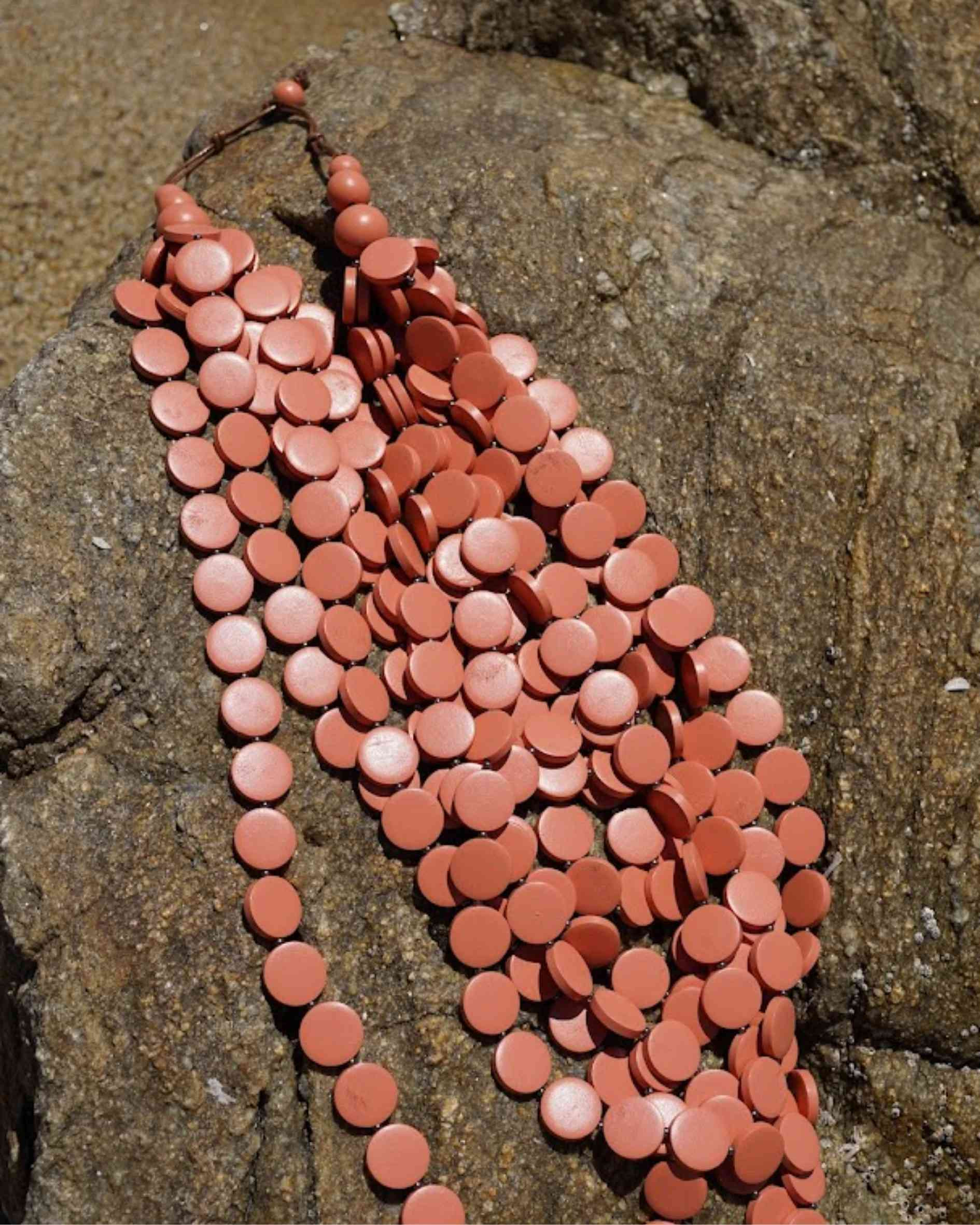 This necklace features multiple strands of lightweight beads in a warm sienna shade, each with a smooth matte finish that rests comfortably against the skin. The strands are secured on a durable cord, creating a cascading effect that enhances its bohemian aesthetic. Its earthy color palette makes it easy to pair with neutrals, warm tones and textured fabrics, making it a versatile essential for both beach days and everyday styling.
