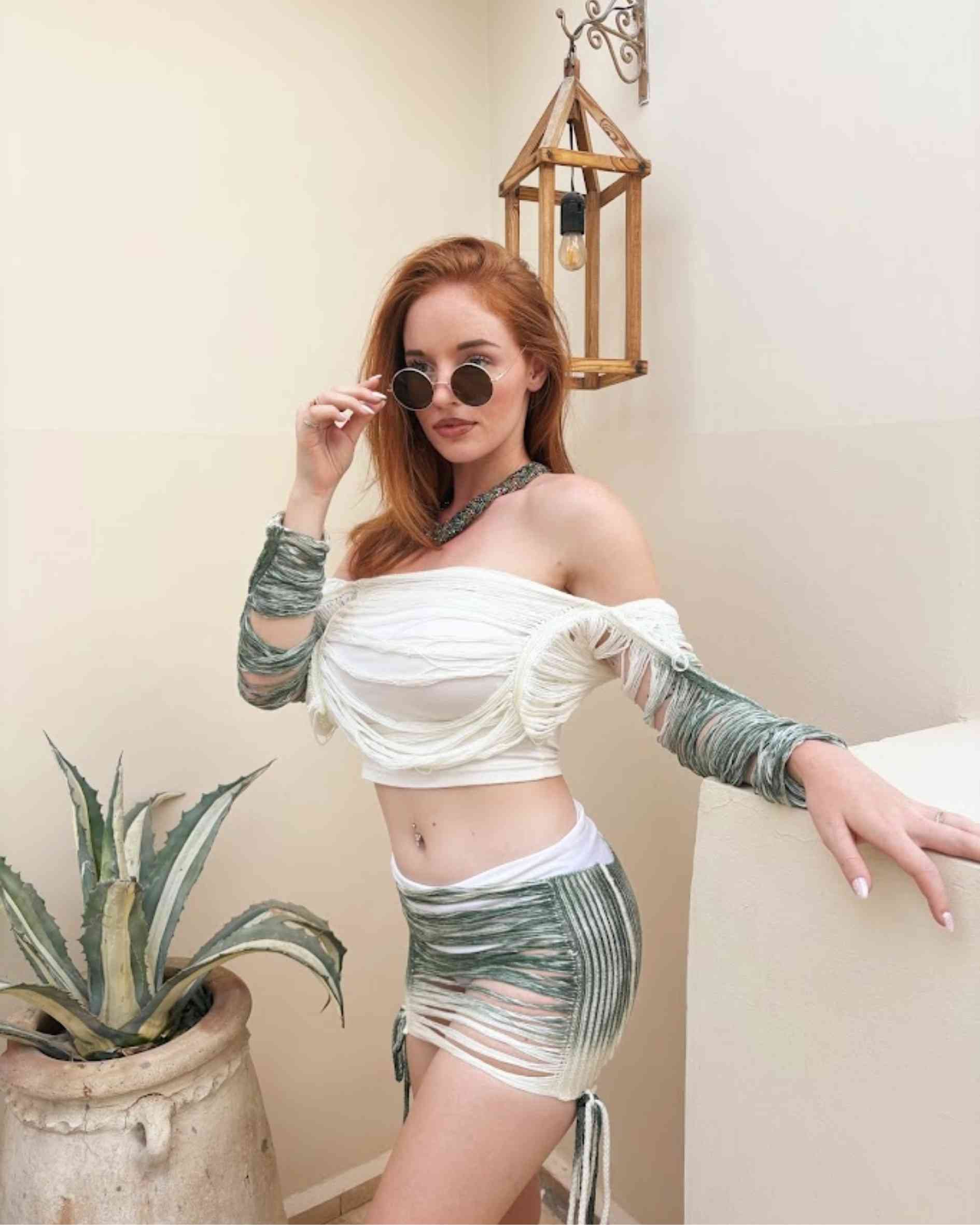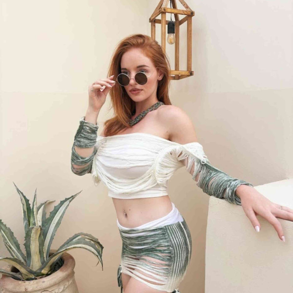 This set is made from lightweight, stretchy mesh that drapes softly over the skin, creating a comfortable and flattering silhouette. The off-shoulder top features long sleeves with ruched, shredded detailing, while the matching skirt includes adjustable ties on the sides, allowing you to tailor the length and fit. The soft ivory base transitions into a forest-green fade, giving the set a natural, organic look inspired by coastal and bohemian aesthetics. Its breathable, semi-sheer texture makes it ideal for layering over bikinis or styling as a statement resort outfit.