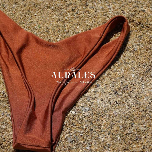 This bikini bottom is crafted from a smooth, lightly shimmering fabric that highlights the deep copper hue and creates a refined, radiant finish. The stretchy material provides a comfortable, form-fitting feel, while the clean, seamless edges enhance its minimal and flattering shape. Fully lined for comfort and support, the design blends simplicity with sophistication, making it a versatile piece that pairs perfectly with the Copper Glow Triangle Top or other warm-toned swimwear.