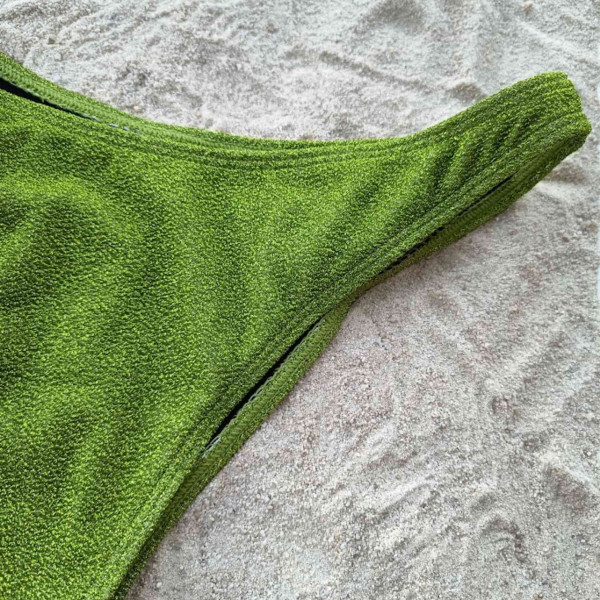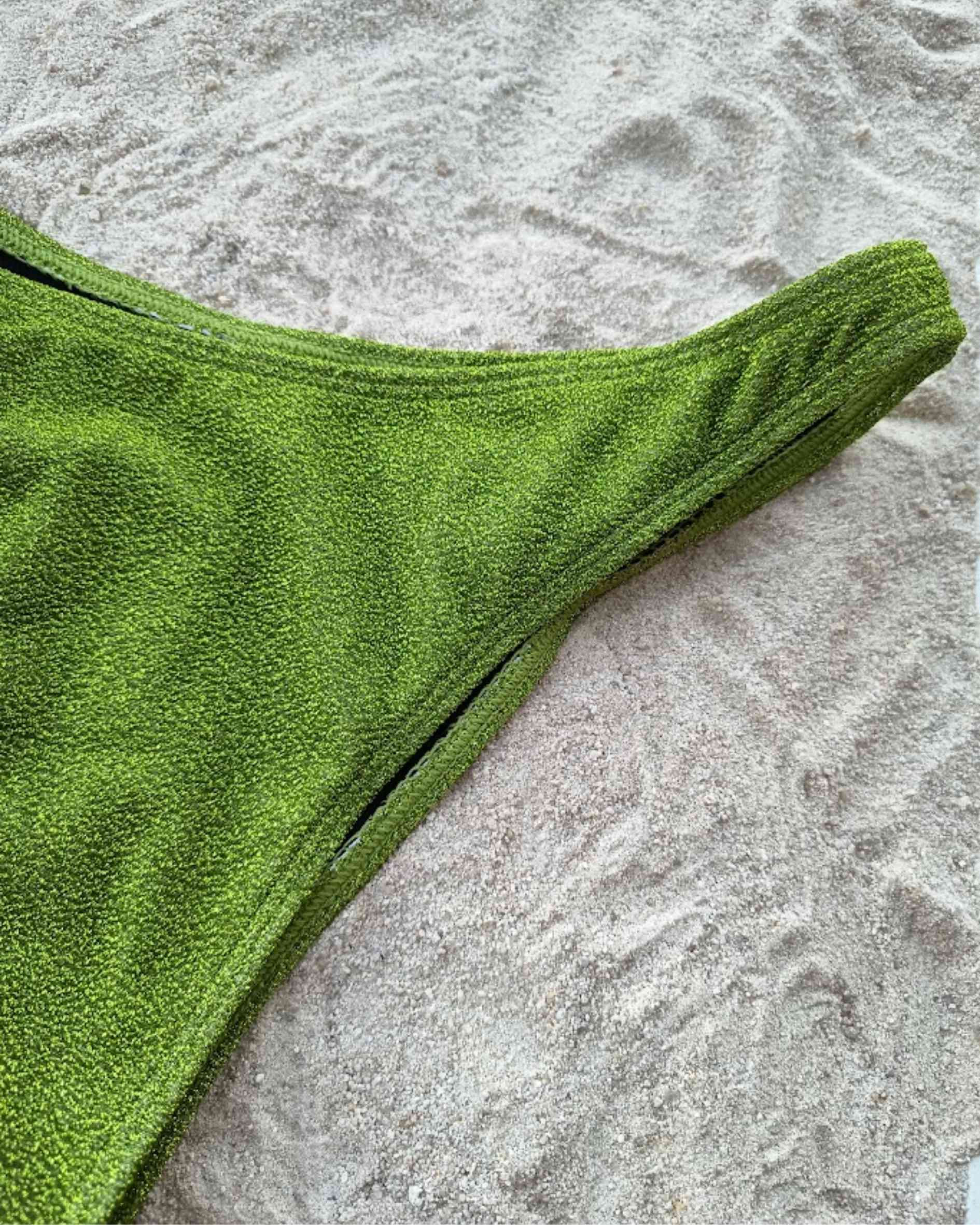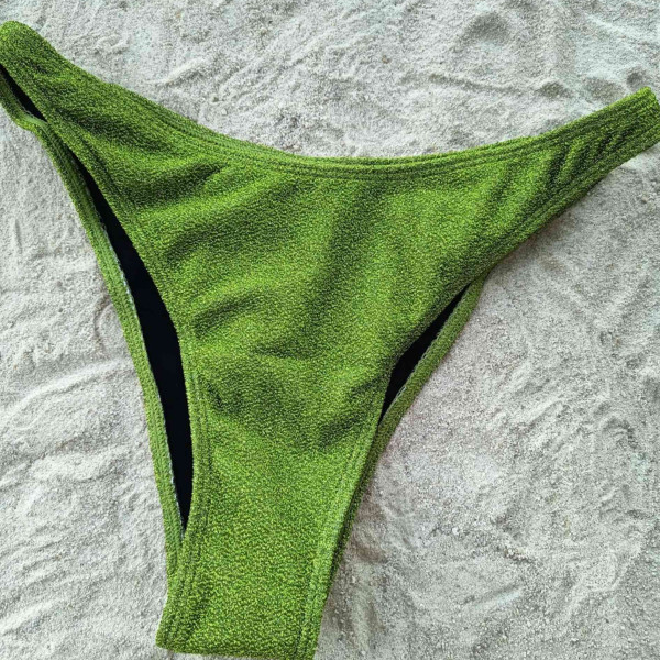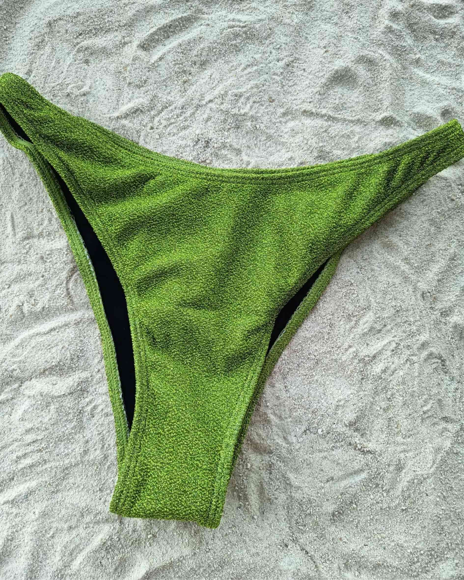This bottom is crafted from a gently stretchy, textured fabric that molds smoothly to the body while maintaining a soft, cozy feel. The clean, minimal shape is designed to elongate the legs and enhance the waistline, while the full lining adds comfort and support. The island-green shade complements warm skin tones and blends seamlessly with other earthy or bright swim pieces.