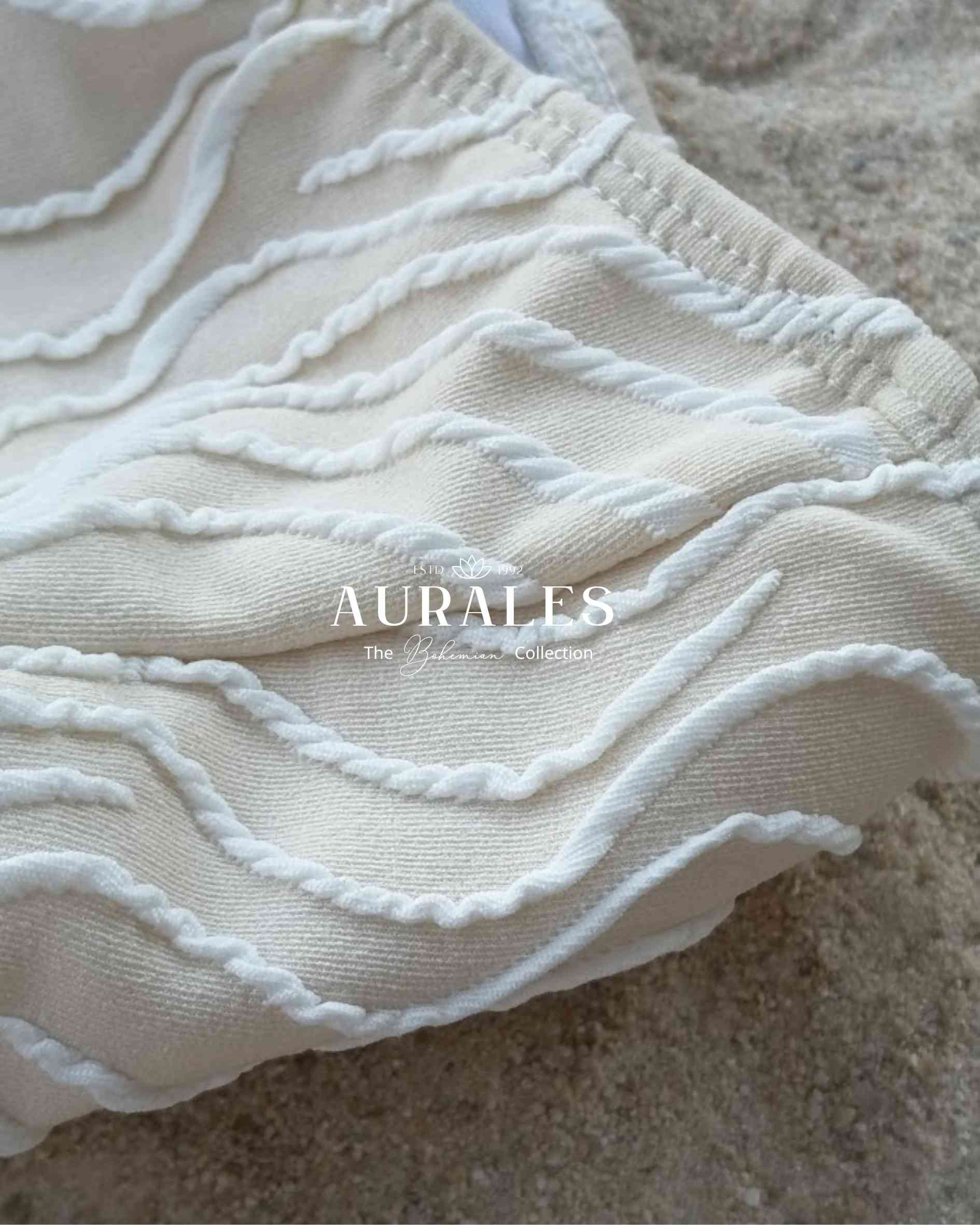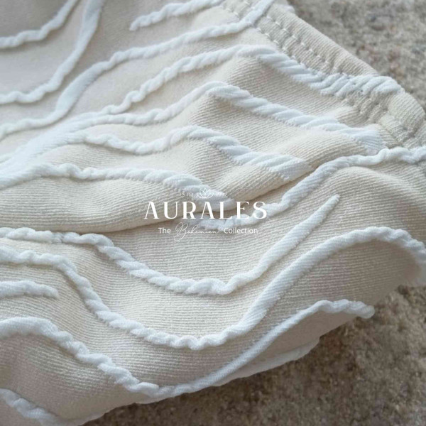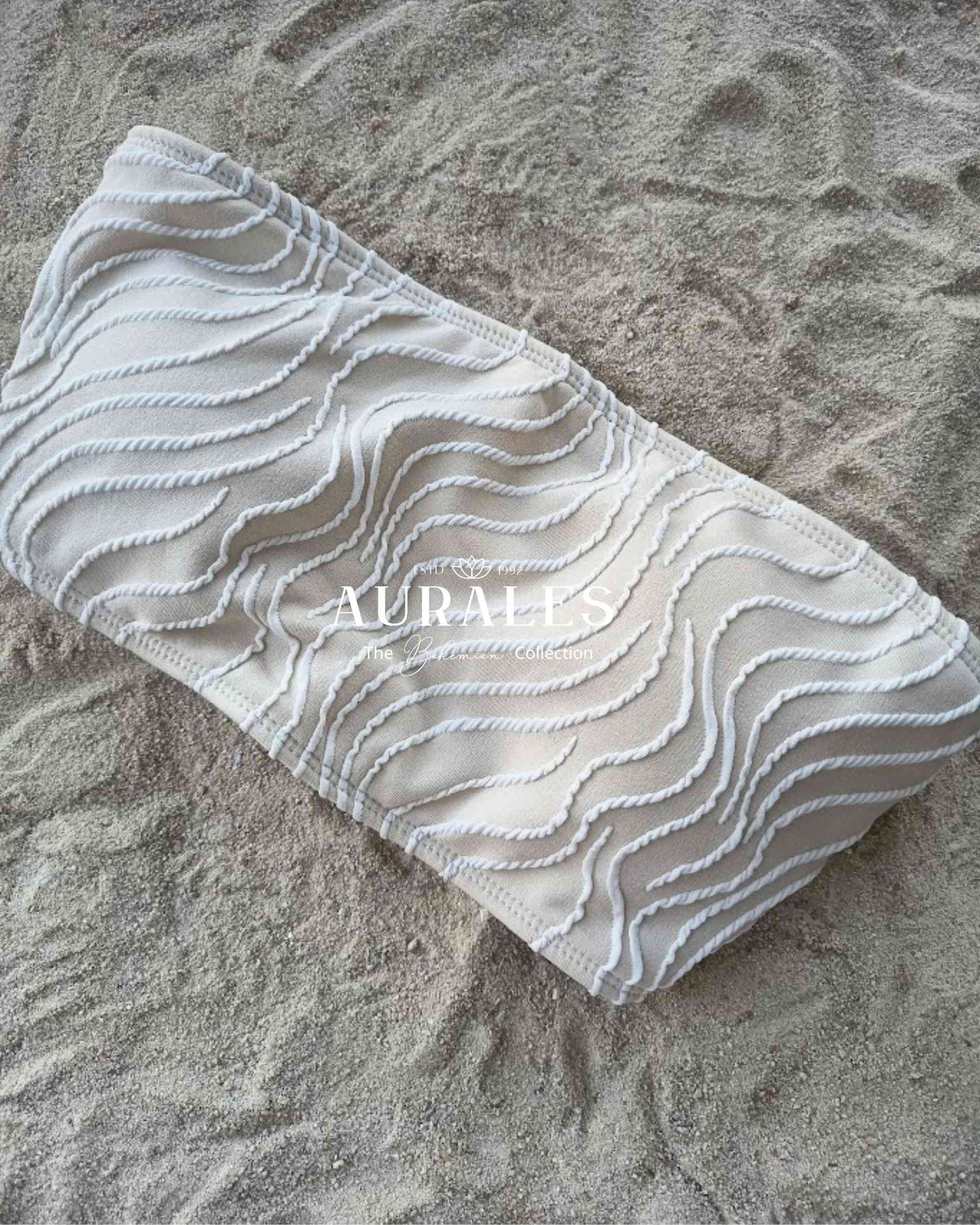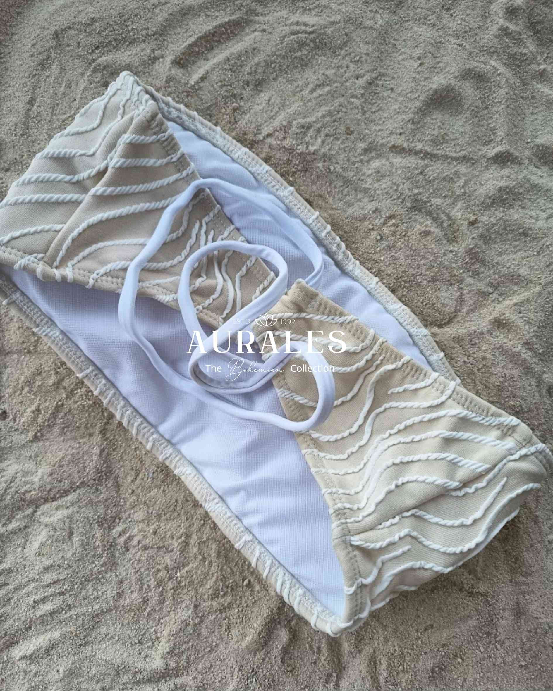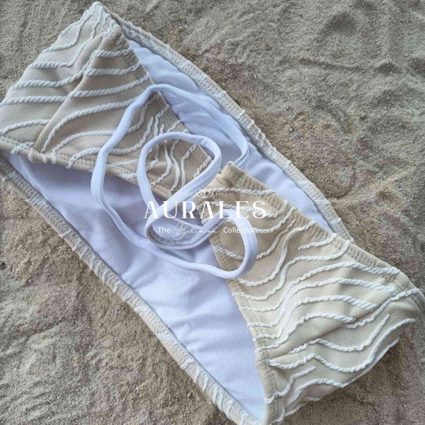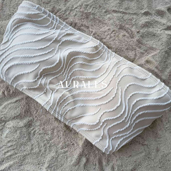 The Sand Wave Bandeau Top captures the calm rhythm of the sea with its elegant wave-textured fabric. Designed in soft beige with delicate white embroidery, this top reflects sunlight with a subtle glow, creating a timeless and sophisticated beach look. The strapless bandeau silhouette offers a modern, minimalist shape that flatters the neckline and stays comfortably in place. Perfect for pairing with the matching bottom or layering under open shirts for an bohemian touch.