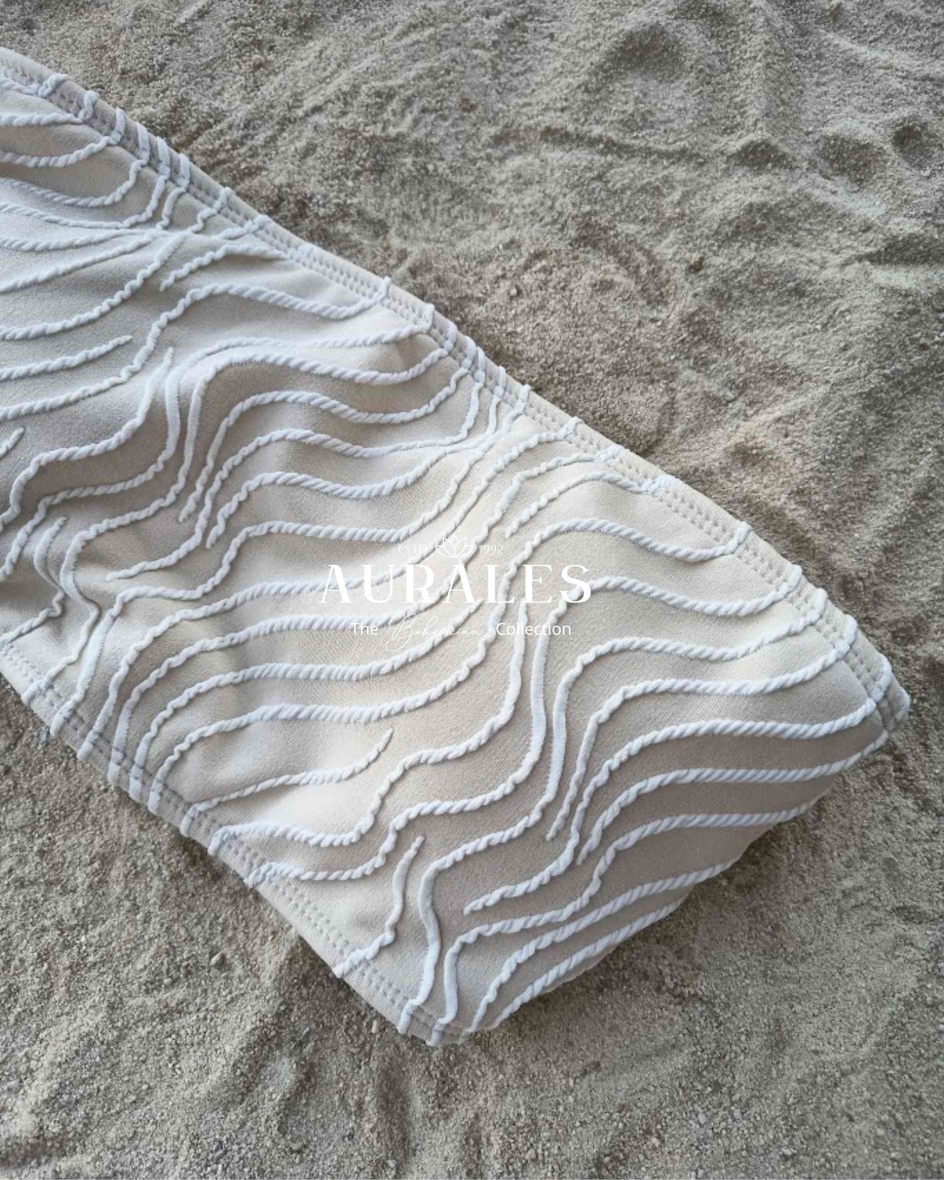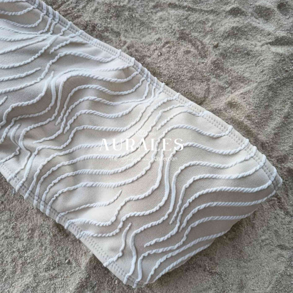 This bandeau top is made from a smooth, stretch fabric featuring a raised wavy pattern that adds dimension and movement to the design. The soft beige base contrasts gently with the white textured embroidery, creating a natural, sand-inspired aesthetic. Fully lined for comfort and support, the bandeau style provides a secure fit while maintaining an elegant, sculpted shape. The seamless finish enhances its refined, elevated appearance, ideal for both swim and resort wear.