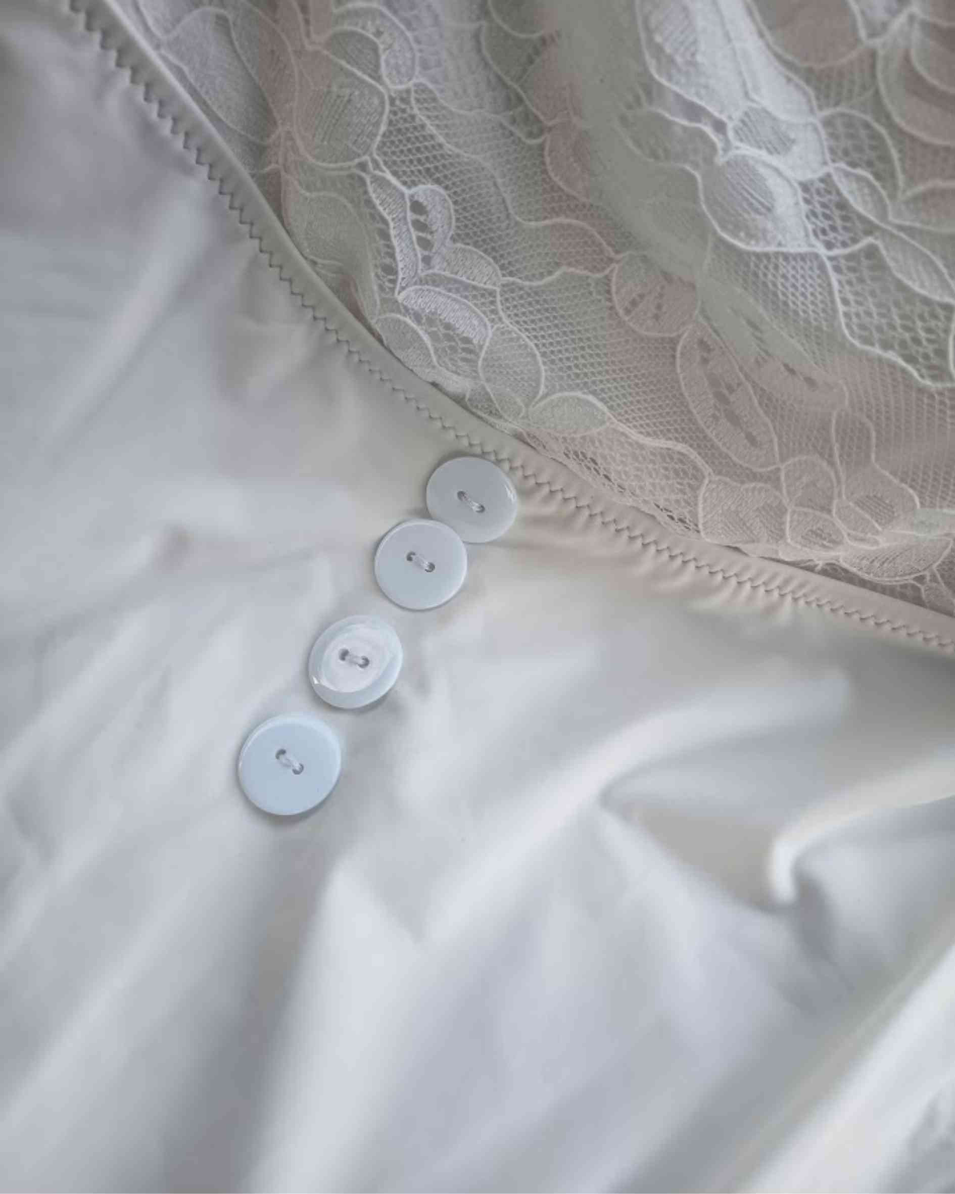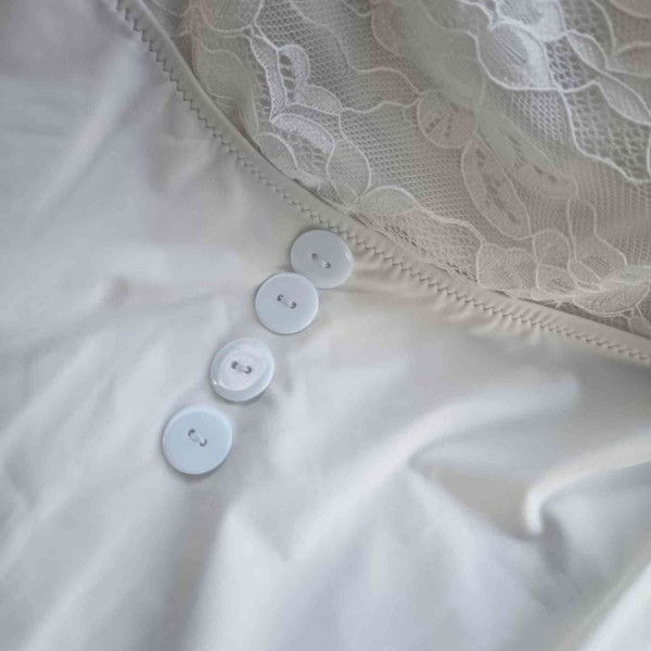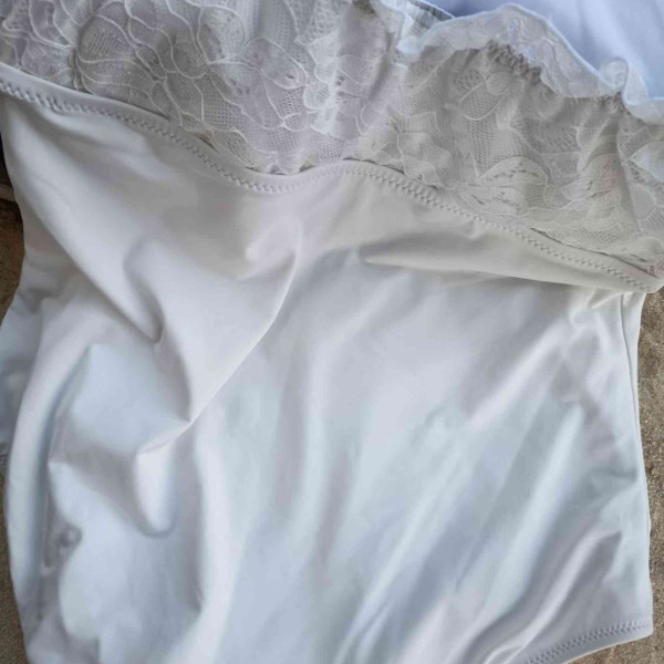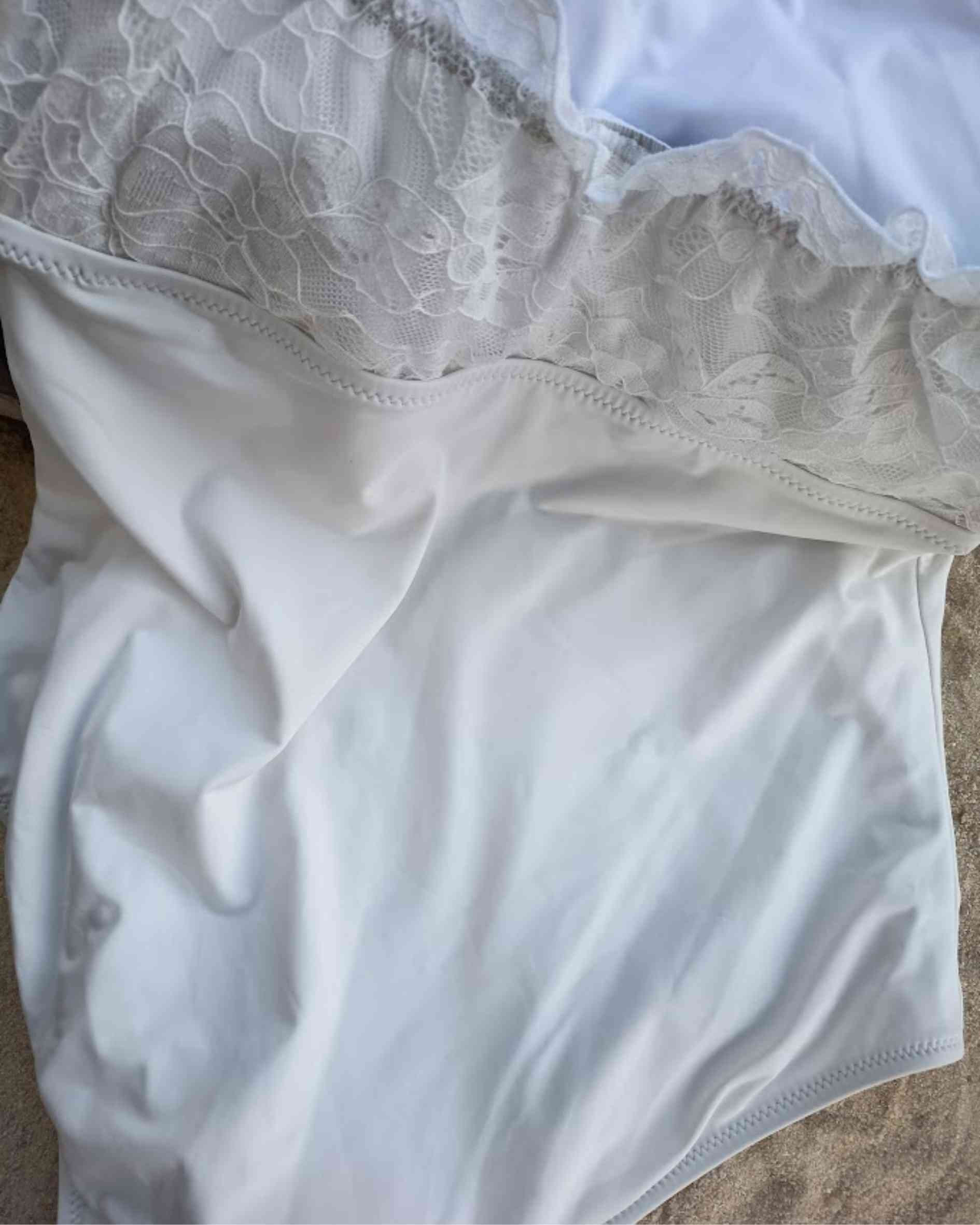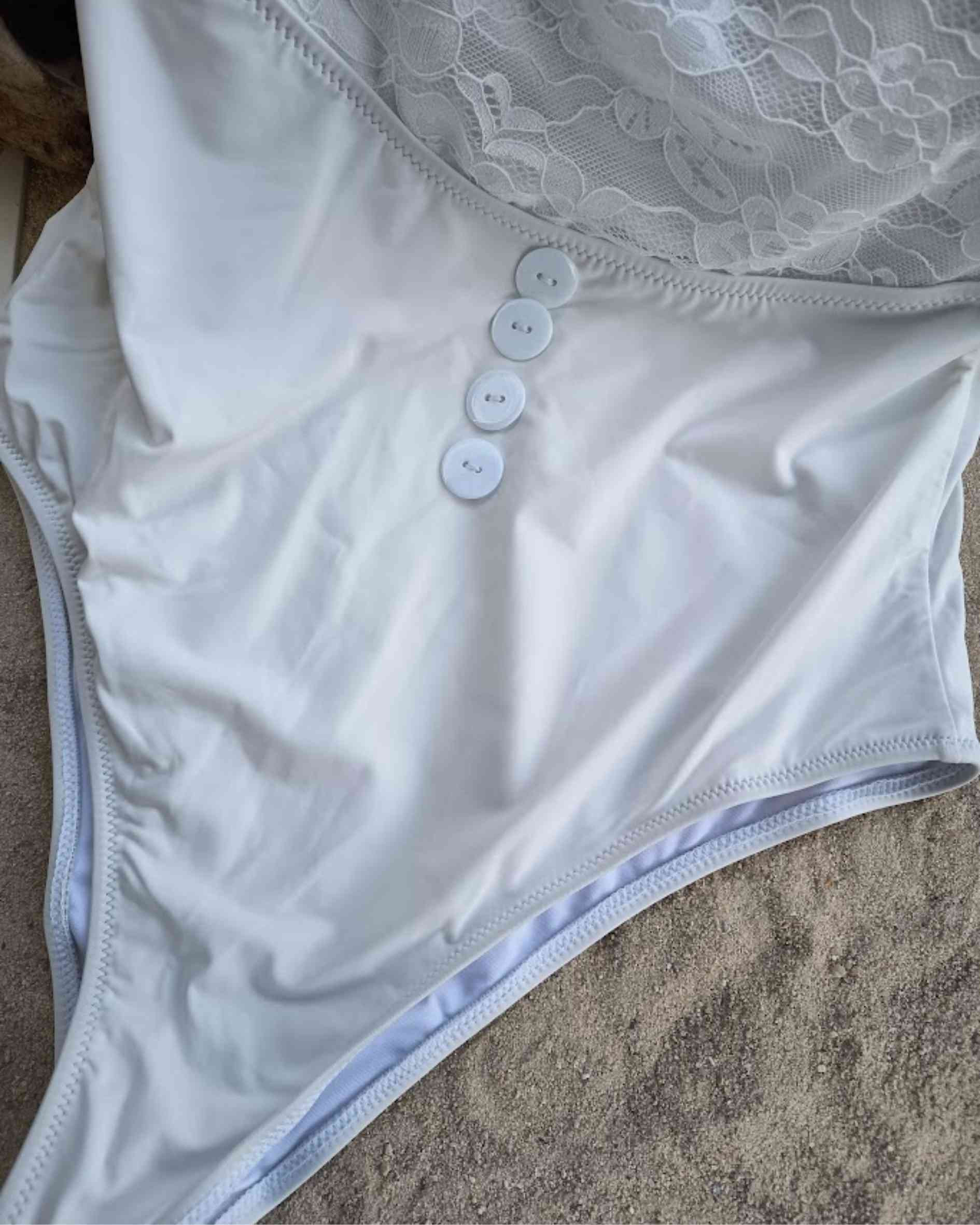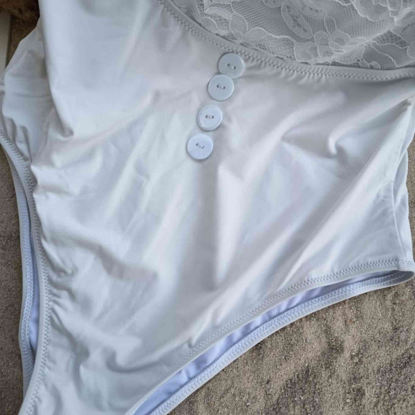 This one-piece swimsuit is made from smooth, high-quality stretch fabric that offers both comfort and gentle support. The lace-trimmed neckline brings a feminine charm, while the decorative front buttons enhance its vintage-inspired aesthetic. Fully lined for a secure and comfortable fit, the design combines structure and softness, providing both elegance and ease of movement. The strapless cut enhances natural lines, making it a versatile piece for both swim and resort wear.