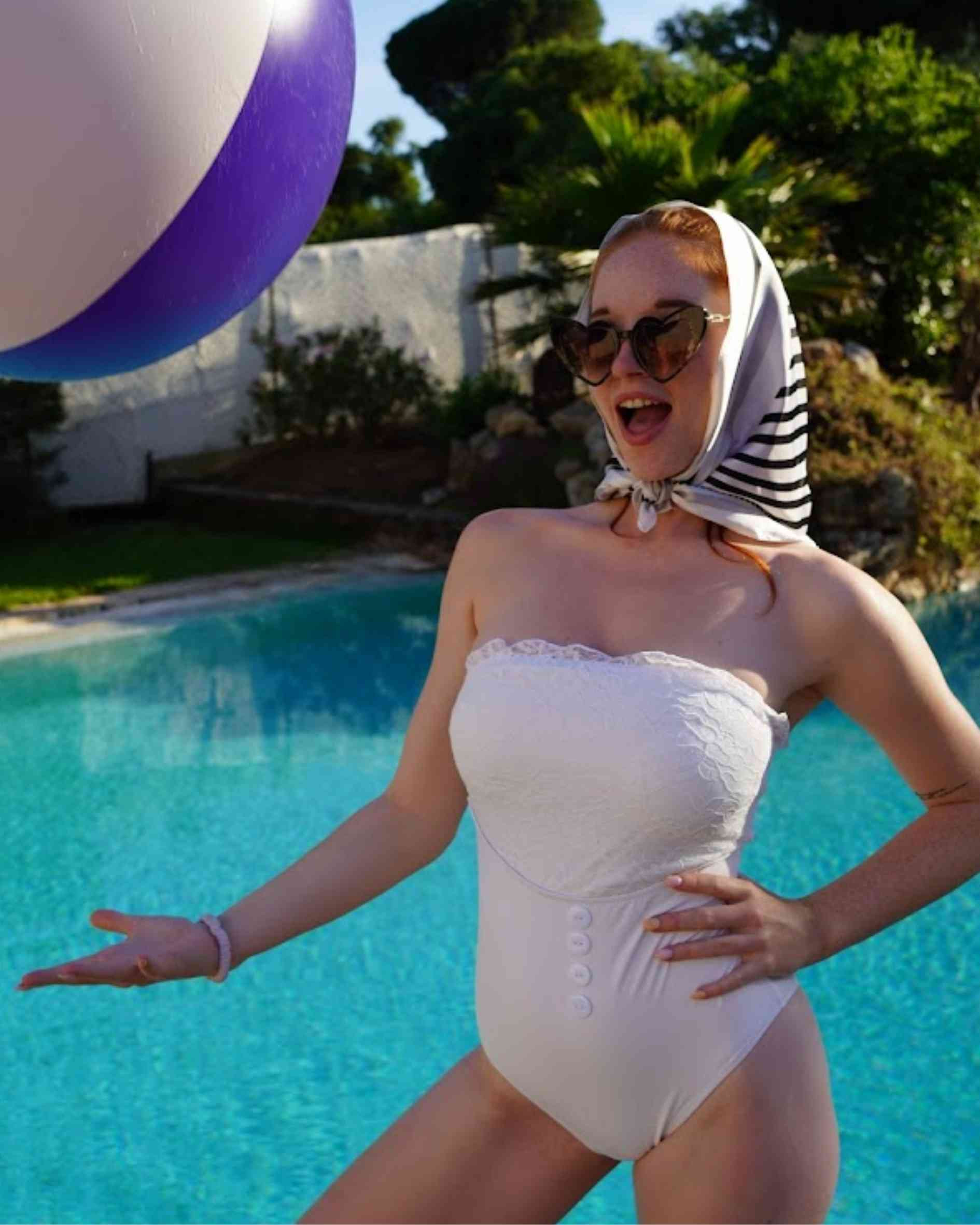 The Élise One Piece is the epitome of vintage elegance with a modern twist. Designed in a soft ivory tone, it features delicate lace detailing along the neckline and subtle button accents down the front, adding a touch of timeless femininity. The bandeau silhouette beautifully highlights the shoulders, creating a refined look perfect for poolside lounging or romantic seaside escapes. Chic, sophisticated and endlessly flattering — this piece captures the essence of classic French allure.